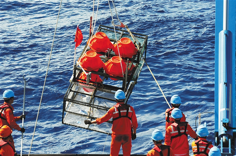 考察队员将负责拍摄和诱捕生物的“彩虹鱼”第二代着陆器回收到甲板。由上海海洋大学和西湖大学联合组成的“彩虹鱼”科考团队,12月11日在全球最深的海沟——马里亚纳海沟成功完成两台“彩虹鱼”第二代着陆器的万米级海试,深度分别为10918米和10899米。新华社记者 张建松 摄