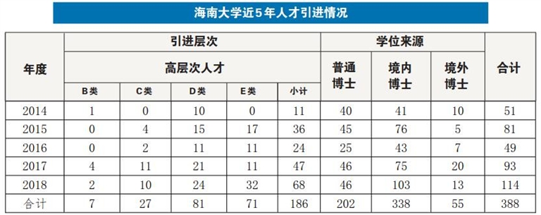 据统计,近一年来,海南大学快速引进和培养了“长江学者”“国家杰青”“万人计划”领军人才等高层次人才6人;引进95名博士人才,其中B类高层次人才2人、C类9人、D类21人、E类25人,引进的人才层次进一步提高,规模进一步扩大。特别是,该校教授唐朝荣入选“2018年度国家杰出青年科学基金建议资助项目申请人名单”,成为海南建省办经济特区以来自主培养的第一位“国家杰青”。