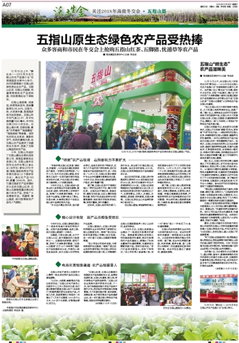 12月15日上午,“醉生态——2018冬交会五指山市农产品推介会”在海南国际会展中心举行,向市民客商推介五指山的绿色原生态农产品。五指山红茶、五指山五脚猪、忧遁草等特色农产品受热捧,市民客商纷纷下单购买。