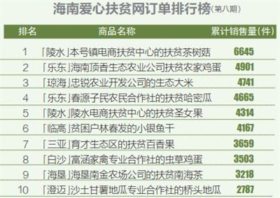 第八期榜单销量排行榜前三甲格局较上周没有变化。订单排行榜中,除了一直居于榜首的陵水本号镇电商扶贫中心的扶贫茶树菇之外,乐东海南顶香生态农业公司扶贫农家鸡蛋也一直非常热销,在排行榜中多次居于前列。而琼海忠锐农业开发公司的生态大米一度跃居到排行榜第三位。