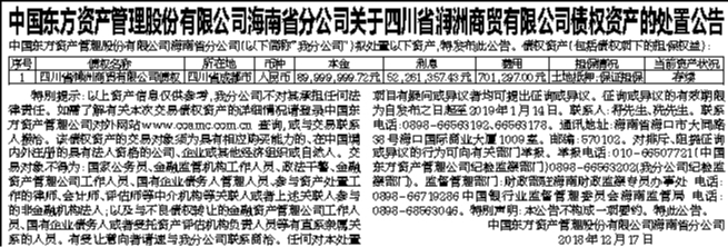 中国东方资产管理股份有限公司海南省分公司关于四川省润洲商贸有限公司债权资产的处置公告