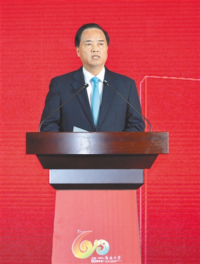 刘赐贵向学校全体师生员工和海内外校友表示热烈祝贺,向长期以来关心、支持、参与海南大学建设的各界人士表示衷心感谢。他说,60年来,在党和国家亲切关怀下,在社会各界支持下,海南大学培养出近30万名栋梁之才,涌现出一批领军人才,为服务国家战略和海南发展大局作出了突出贡献,特别是党的十八大以来,学科建设取得了令人瞩目的成绩,成为我省高等教育当之无愧的龙头。