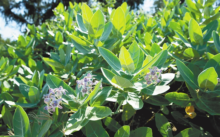 “这是牛角瓜,也叫五犬卧花心,每朵花有五个花瓣,每个花瓣像小狗一样,卧在花心之中,因此而得名。牛角瓜具有药用价值,在印度被认为是传统的药用植物,其根、茎、叶和果等均可药用,具有消炎、抗菌、化痰和解毒等作用,用于麻风病、哮喘、咳嗽、溃疡和肿瘤等疾病的治疗。牛角瓜的乳汁具有强心、保肝、镇痛消炎等疗效,树皮可治癫痫。”黄青良告诉我们。