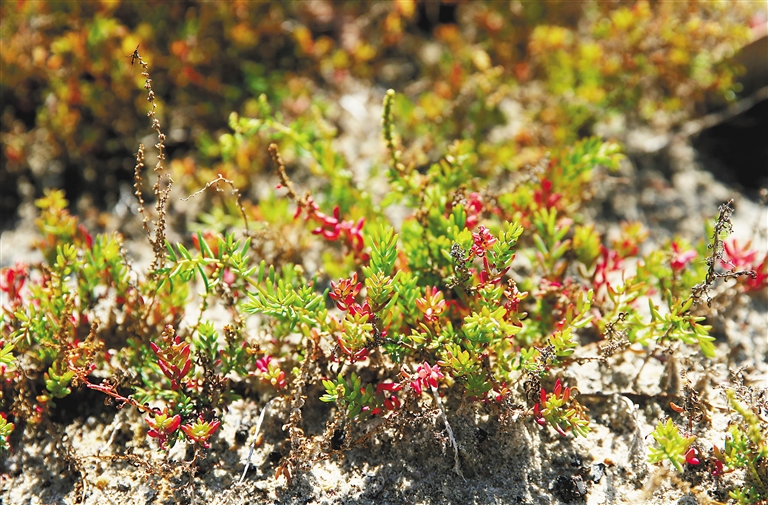 “这是南方碱蓬,是非常耐盐碱的一种植物,生于海滩沙地、盐田堤埂等处,常成片群生或盐地碱蓬混生。主要分布于江苏、福建、台湾、广东、海南、广西。澳大利亚、日本南部也有。”