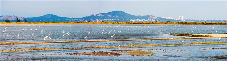 2107年,在海南省野生动植物保护管理局组织的海南越冬水鸟调查中,就发现了另外一种世界级的濒危鸟类黑脸琵鹭,这说明该片湿地是整个东亚至澳大利亚的候鸟迁飞线路上的重要节点之一。