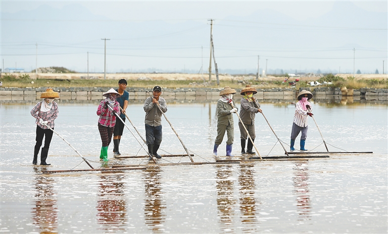 大约40公里外的尖峰岭和连绵群山,又形成了一道陆地上的天然屏障,挡住了来自东北方向频繁的狂风暴雨,使这里一年中的大部分时间,都是烈日当空,晴天少雨,这里强烈的阳光,使海水从纳潮到成盐,只需要31天,盐业生产条件十分优越。