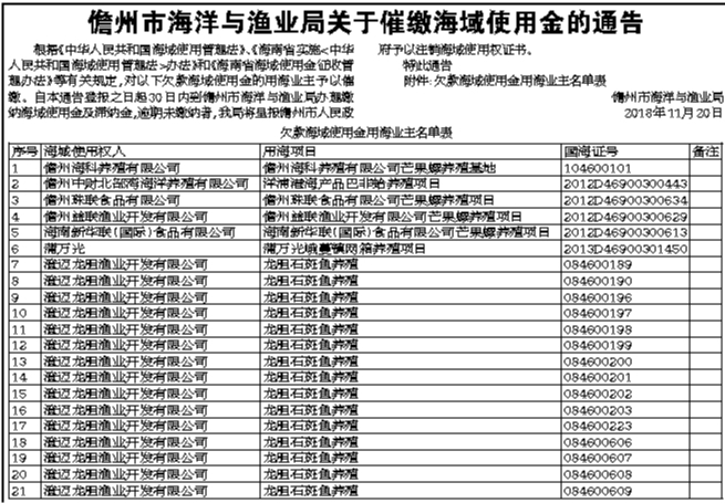 儋州市海洋与渔业局关于催缴海域使用金的通告