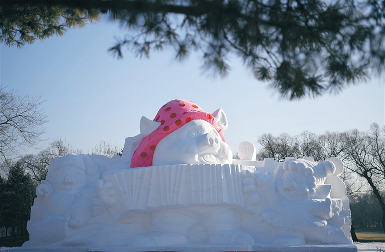 12月17日拍摄的“欢乐金猪”主题雪雕。