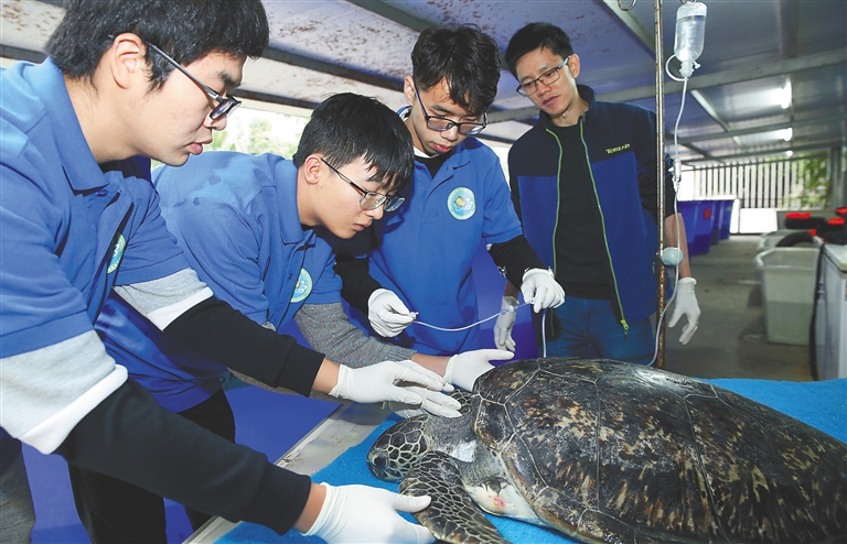 据海南师范大学龟鳖研究与保护中心林柳博士介绍,目前,海南师范大学海龟救助站正在救治绿海龟、玳瑁、红海龟等21只海龟,治愈后将陆续放归大海。这些海龟是由执法部门罚没或爱心群众送来救治的。