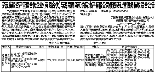 宁波腾超资产管理合伙企业(有限合伙)与海南穗甬和悦房地产有限公司债权转让暨债务催收联合公告