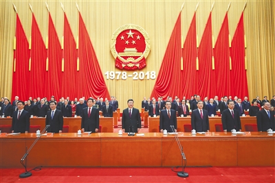 人民大会堂雄伟庄严,万人大礼堂灯火辉煌、气氛热烈。主席台上方悬挂着“庆祝改革开放40周年大会”会标,后幕正中是中华人民共和国国徽和“1978-2018”字标,10面红旗分列两侧。