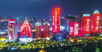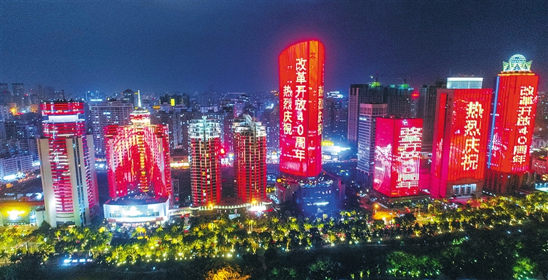 12月18日晚,海口滨海大道的楼宇夜景灯光打出“庆祝改革开放40周年”字样,格外璀璨。
