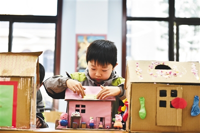 12月19日,一名小学生用瓦楞纸箱和其他辅助材料搭建房屋模型。