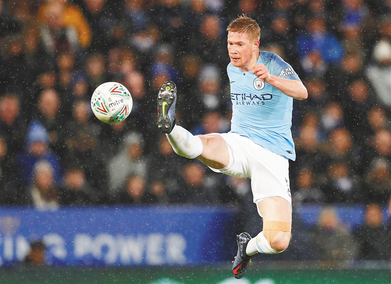 北京时间12月19日,在英格兰联赛杯四分之一决赛中,曼彻斯特城队通过点球大战,在客场以4:2战胜莱斯特城队,晋级四强。图为曼城队球员德布劳内在比赛中。 新华社发