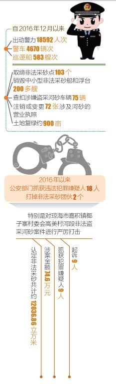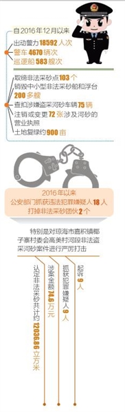 2016年12月以来先后出动巡查力量18592人次,出动警车4670辆次,出动巡逻船583艘次;取缔非法采砂点103个,清理非法堆砂点115个,销毁中小型非法采砂船和浮台200多艘;查扣涉嫌盗采河砂车辆75辆;注销或变更72张涉及河砂的营业执照;土地复绿约900亩。