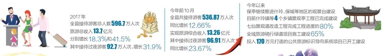 近年来,保亭以建设“雨林温泉谧境,国际养生家园”为奋斗目标,以打造宜居宜业宜游宜养的全域旅游示范县为抓手,不断适应新环境、新形势、新常态,完善县域内旅游基础设施,同时,创新旅游营销手段,积极融入“大三亚”经济圈,旅游接待能力进一步增强,旅游知名度和美誉度不断提升,呈现“旺丁又旺财”的良好局面。去年全年,保亭接待游客总人数596.7万人次,旅游总收入13.7亿元,分别增长18.3%和41.5%,其中接待过夜游客92.7万人次,增长31.9%;今年前10月,全县共接待游客536.87万人,同比增长12.66%,实现旅游综合收入13.26亿元,其中全县接待过夜96.91万人,同比增长23.67%。