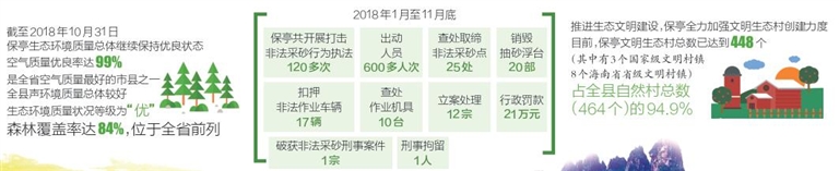 牢固树立生态立县和实践“绿水青山就是金山银山”的发展理念,保亭以改善环境质量为核心,以改革创新和环保督察为动力,结合生态环境“六大”专项整治及美丽乡村建设工作,扎实推进县域生态文明建设和环境保护工作,建立健全生态文明建设长效机制,服务“一城一园两基地”建设。