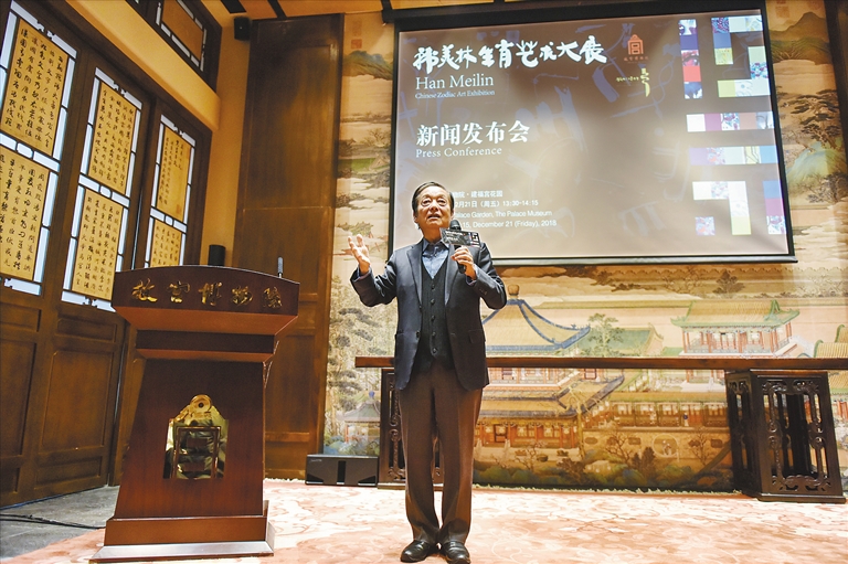 12月21日,故宫博物院举行新闻发布会,宣布“韩美林生肖艺术大展”将于2019年1月5日在故宫文华殿开幕。图为艺术家韩美林在新闻发布会上介绍自己的创作情况。