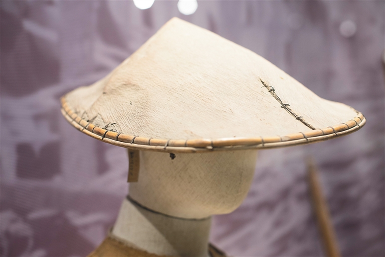 展出的一件藤编灯架也很有特点。上方打结的地方如现在常见的中国结,下方横置的木杆上放着灯座。据了解,当年,大家用蓖麻等植物籽榨油燃灯,而从上世纪30年代开始,煤油灯从汉族人聚集区逐渐普及,这样的灯架也就逐渐淡出了人们的生活。
