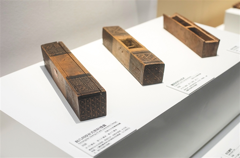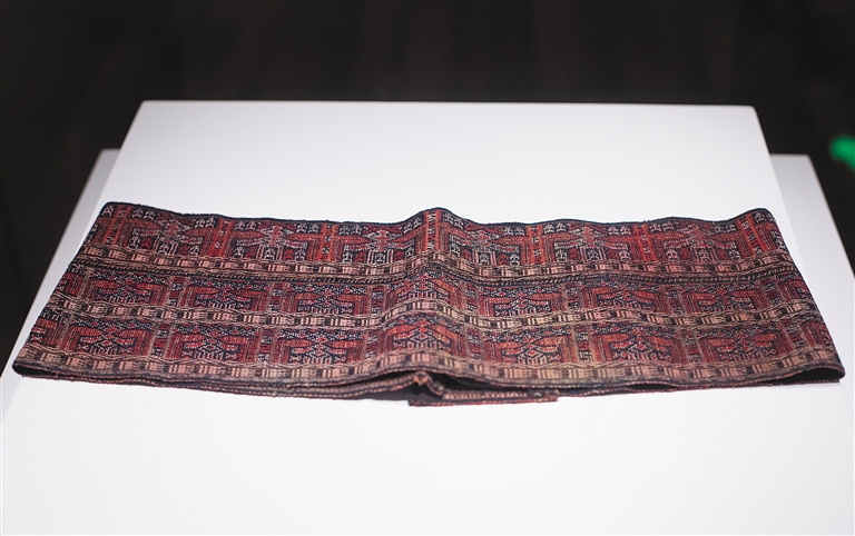 藤编腰篓是黎族人民生活中常见的物品,而此次展出的一个腰篓,其精美程度让省博物馆工作人员感叹。这个腰篓整体为胡桃木色,除了编织精细外,分层也十分整齐,底座由铜钱编制而成。值得一提的是,它的配绳上也对称缀有木质圆珠和铜钱,陈列在柜中如一件精致的摆设。