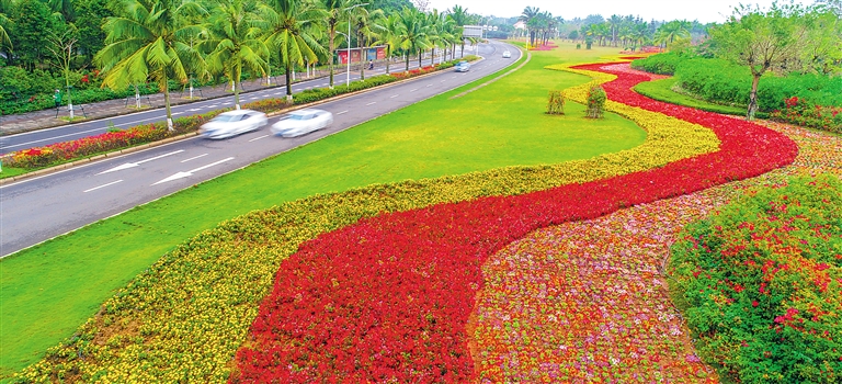 花如海、绿如潮。为了给椰城营造喜庆祥和的节日氛围,海口园林部门计划在滨江路、国兴大道、滨海大道等7条主要道路和9个重要节点摆设矮牵牛、万寿菊、一串红、非洲凤仙、鸡蛋红等7种时花35万盆、三角梅近1万盆。此外,还将在万绿园、金牛岭等公园内摆放各类花卉植物,喜迎2019年元旦。图为海口市滨江路,万盆鲜花形成一条蜿蜒绽放的花带。文/本报记者 计思佳 图/本报记者 张茂