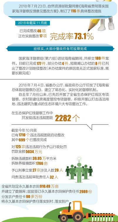 严守生态保护红线。近年来,我省先后系统开展生态环境六大专项整治和生态保护红线区专项督察,瞄准环境突出“病症”和长期累积的难点问题严查严治,并提出了到2020年海南城乡环境建设、自然生态系统恢复、环境质量水平应达到的各项具体量化指标。