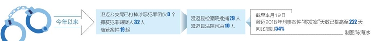 澄迈县委常委、县公安局长潘秋光介绍,澄迈把打击锋芒始终对准群众反映最强烈、最深恶痛绝的各类黑恶势力违法犯罪,今年以来,澄迈公安局已打掉涉恶犯罪团伙3个,抓获犯罪嫌疑人32人,破获案件19起;澄迈县检察院批捕29人;澄迈县法院判决10人。截至本月19日,澄迈2018年刑事案件“零发案”天数已提高至222天,同比增加54%。