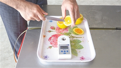 张九明介绍,按照橙树生长周期来说,现今基地里橙树的树龄达18年,已到了老化时期,但由于管护到位,这批果树依旧生机盎然,且拥有自身的优势,孕育出来的果实含糖度以及口感更佳。海南日报记者从果园随机采摘了3个表皮橙黄的果子,使用测糖仪检测发现,含糖度分别为16.7度、17.6度、15.3度,比12度的标准高出不少。