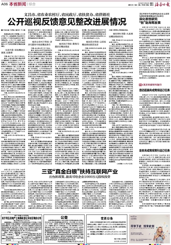 整改:省供销社党委班子深入学习习近平总书记“4·13”重要讲话精神和关于“继续办好供销合作社”的重要批示精神,认真落实省委、省政府工作部署,积极争取全国供销合作总社政策支持,积极探索设立中国供销电子商务公司海南总部基地,加快推进建设农村综合服务和电子商务体系。目前,已注册成立海南海供乐农网络科技有限公司,经中国供销电子商务发展联盟批准成为会员单位,经与三亚、澄迈、定安、五指山积极沟通协调,大力推介农产品上线省社电商平台和海南爱心扶贫网。