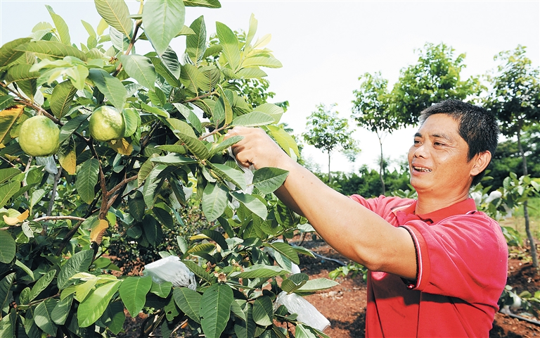 图②:澄迈县福山镇敦茶村洋道村民小组脱贫户符善南忙着为自家的番石榴鲜果套袋。作为洋道村民小组曾经唯一的贫困户,符善南播洒勤劳的汗水,种下10余亩番石榴,并通过“触网”销售鲜果,加入合作社发展乡村旅游,成功摘去“贫困帽”。本报记者 苏晓杰 摄