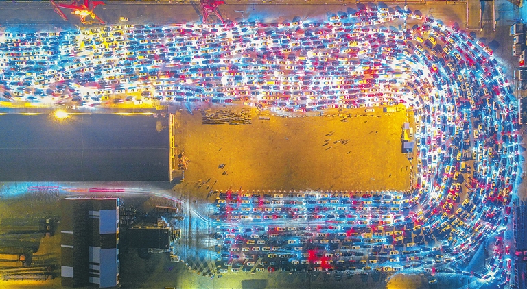 图⑥:2月21日晚,海口市秀英港码头,滞留车辆有序排队登船离港。春节黄金周期间,琼州海峡遭遇67年不遇的持续性大雾天气,多次封航,导致上万辆车滞留港口。在海南省、海口市多部门应急联动协作下,截至当日21时,海口各港口7天累计运送约8.2万辆汽车安全过海。本报记者 张茂 摄