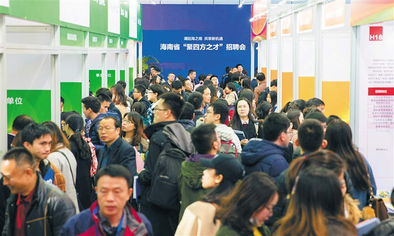 图⑦:11月10日上午,海南省“聚四方之才”招聘会在北京中关村国家自主创新示范区展示中心举行。招聘会进行了现场人才洽谈。现场设置了公务员(选调生)、人才和事业单位等3个政策咨询区,设置100多家企业、事业单位展位,应聘者与用人单位进行了现场洽谈。招聘会吸引了大批人才前来应聘,现场人气火爆。本报记者 宋国强 摄