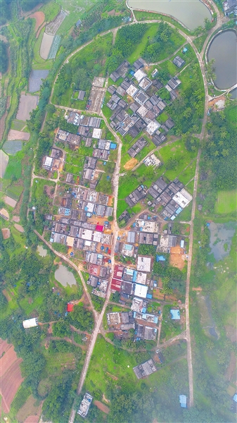 从高空中俯瞰定安县新竹镇次滩村,这个绿意融融的村落,形如一个人的脑袋,又似一个大大的问号。