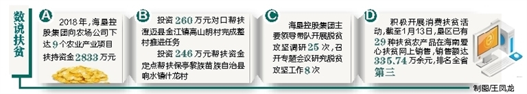 海垦控股集团积极履行国企的社会责任,参与我省开展的“百企帮百村”和“定点帮扶深度贫困村”精准扶贫行动,对澄迈县金江镇高山朗村进行整村推进扶贫开发;帮扶保亭黎族苗族自治县响水镇什龙村发展黎锦手工艺品销售、养猪等产业。