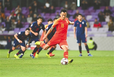 第70分钟,郑智斜传左路空档,武磊得球后迅速横敲禁区中路,郜林得球前趟后被差拉邦绊倒,主裁判果断判罚点球,郜林操刀破门,中国队2:1反超。