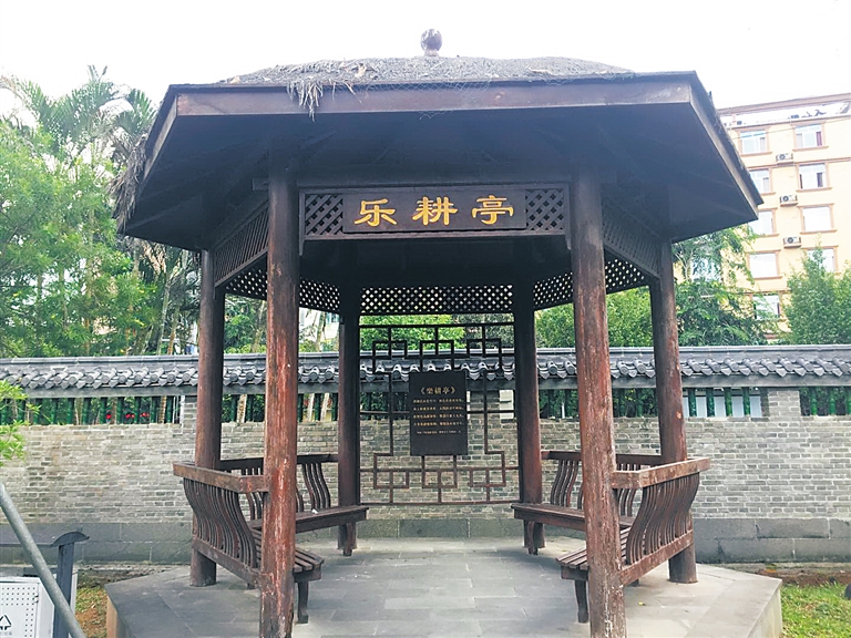 在海瑞故居(今海口府城红城湖路175号)的趣园内,有一座仿古的六角亭。它乍看并不起眼,原木色亭身,没有雕梁画栋、重檐飞角,只是一座茅草顶的单檐单体凉亭。凉亭的正面毗邻书斋与花厅,背靠临街的矮墙。靠外墙的一面,疏窗摇影,阻隔却不拒绝闹市的喧嚣,可谓是古雅素朴、不减清幽。但亭内诗匾以及亭边碑记却向世人昭示,这亭的前身就是始建于明代的乐耕亭(故址在今府城西北二里许,红城湖西畔的墨客村)。500年前,琼州第一流的文人墨客曾在此弈棋观稼,聚而论道。