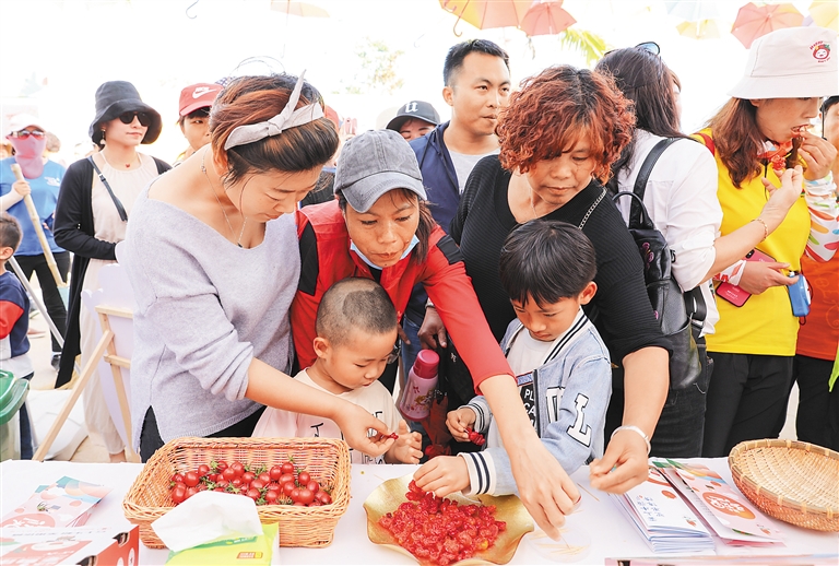 开幕当天,产品展销区、美食街热闹无比,光坡阉鸡、本号茶树菇、香粉蕉等特色扶贫农产品吸引游客购买。本届圣女果采摘季活动在视野上放得更宽,不仅组织陵水其他乡镇产品参展,还与河北省沧州市互动,活动中推介沧州市相关旅游产品、农业产品的同时,也在沧州市推介陵水的产品。