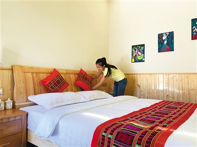 给墙壁贴上木板饰条、铺设床上用品、摆设茶座……王春燕忙得不亦乐乎,忙的同时她还向韩斌请教民宿招牌是否要统一、怎么保障客人生活私密性等问题。韩斌一一给出建议。