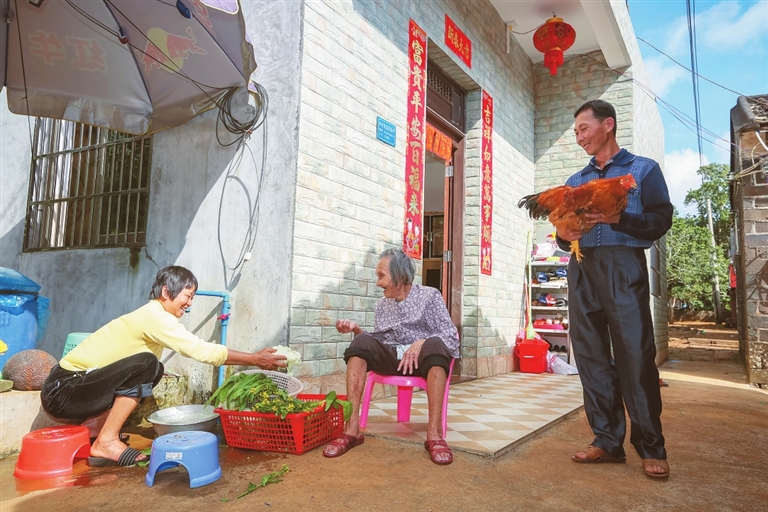 屋外,吴毓夫的妻子王梅燕已经开始为午饭张罗了。从自家菜地里摘来菜心、莴笋,王梅燕一边摘菜一边和90岁的婆婆拉家常。
