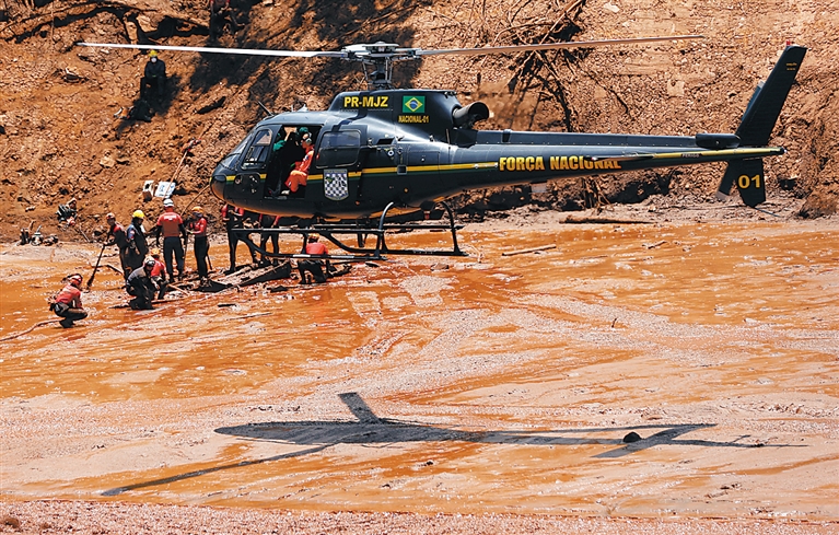 2月2日,在巴西布鲁马迪纽,救援人员在溃坝事故现场附近搜救。