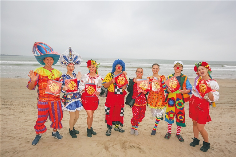 图①2月1日,文昌市高隆湾,外国友人扮成小丑模样在沙滩上送“福”。本报记者 袁琛 摄