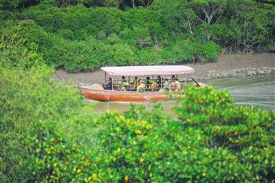 图②游客游览海口市东寨港红树林旅游区。本报记者 袁琛 摄