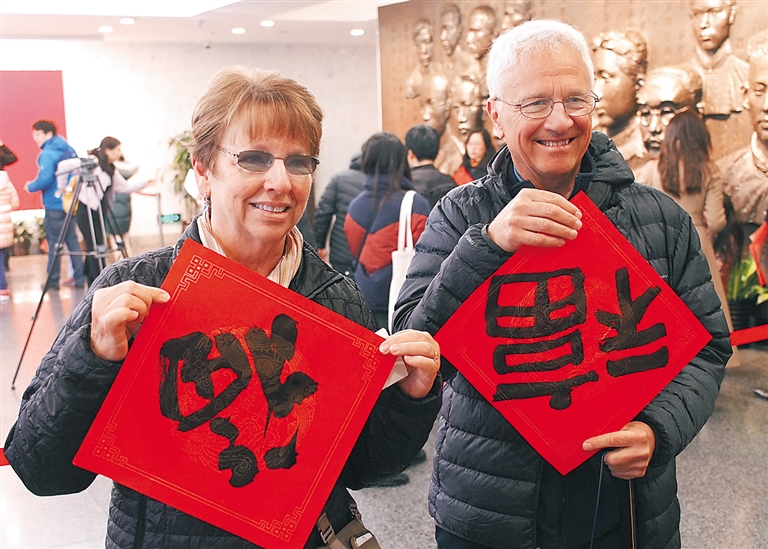 2月4日,来自美国的游客菲舍尔夫妇在中共一大会址纪念馆大厅展示刚领到的“福”字。 新华社记者 任珑 摄