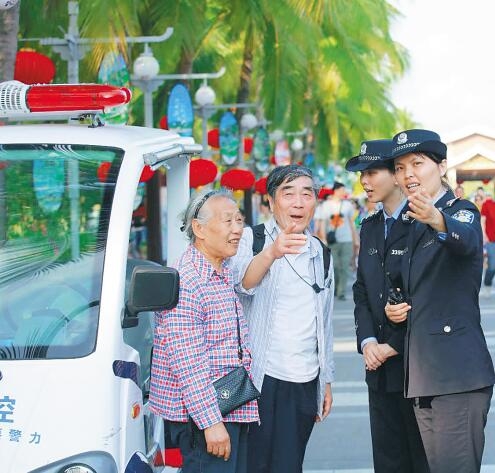 ⬆2月5日正值大年初一,三亚公安边防支队天涯边防派出所的亲姐妹警花陈欣虹与陈玮珊如往常一样,坚守在春节执勤的工作岗位上。图为女警姐妹正在为游客指引景点路线。
