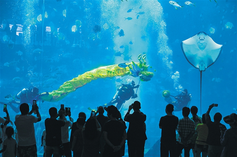 “整场演出融入了水中芭蕾、花式跳水、空中艺术、杂技等多种表演形式,给我们带来了全新的体验。”来自北京的游客姜思琦是一名舞蹈老师,今年是他们一家第三次到三亚过年。会跳舞的“青蛙”、呆萌憨厚的“北极熊”、美丽的“犀鸟”和笨拙的“渔夫”等角色让姜思琦6岁的女儿兴奋不已,不停地用手机定格演出的画面。