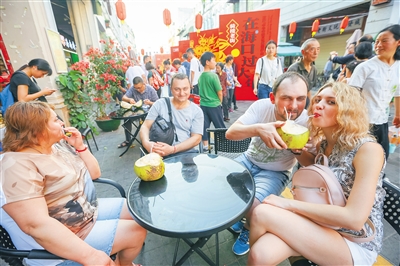 2月6日,海口骑楼老街,外国游客正在喝椰子水,品中国年味。