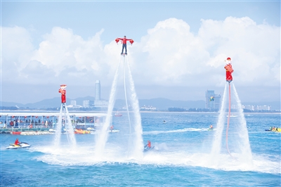 2月6日,三亚蜈支洲岛,海上运动的工作人员为游客送祝福。本报记者 王凯 通讯员 王丰国 摄