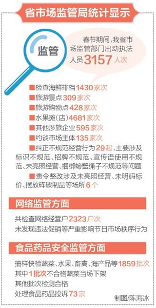 本报海口2月10日讯 (记者罗霞 通讯员王雪梅)春节期间,我省加强市场监管,加大市场抽查检查力度,积极妥善处理消费投诉,全省市场秩序平稳安全有序。