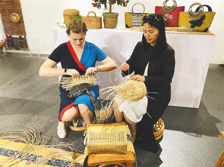 在“我们的节日——首届海南岛国际艺术生活展”的现场,主办方还设置了五大艺术交流互动版块。海南省级黎族传统纺染织绣技艺代表性项目传承人黄丽琼,为市民和游客演示黎锦的纺、染、织、绣的制作工艺过程,教大家如何用棉花搓成纺线,用天然的植物染料染色的工艺流程;中国民间文艺家协会会员黄海桃跟观众们互动,教大家现场剪出中国富有美好寓意的窗花剪纸;海南省旅琼文艺家协会于学龙、循本学堂的老师和小朋友跟现场观展的观众一起用毛笔书写万福,留下对2019年新春的美好祝愿;海南香树沉香首席文化官林雨昕女士,为大家现场主持猜香篆活动,通过闻香辨香来了解沉香的现代生活应用与普及,并给大家送上香礼;在海南黎藤艺术展示馆,海南省民协艺术家杨育萍现场讲解海南黎藤编织艺术的历史、现状、发展优势及黎藤产品在日常生活中的运用,以海南黎藤材料与小朋友、游客们互动体验编织艺术,传播工匠技艺,领略非遗传承的意义,受到市民的赞赏。现场的互动环节成为本次展览的特色。