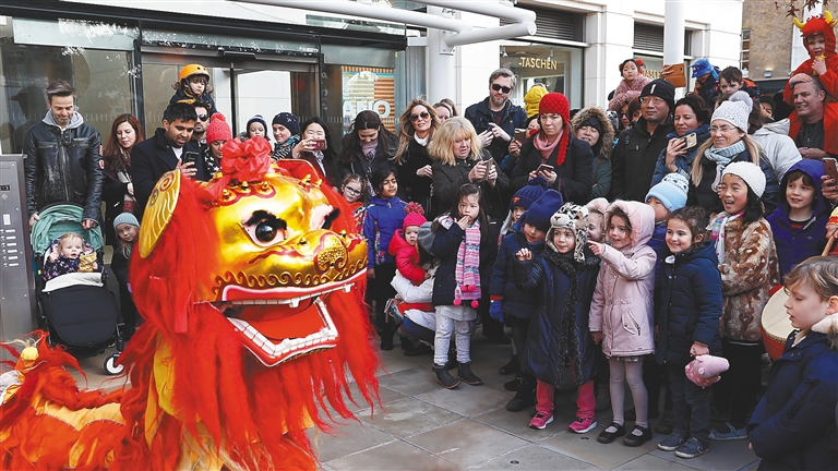 2月9日,在英国伦敦,人们观看舞狮表演。